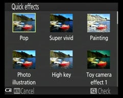 The shooting menu also offers something called Quick effects. With this activated you can apply effects filters to a shot just after you’ve taken it. Effects include Pop, Super vivid, Painting, Photo illustration, High key, Toy camera effect, Cross process, fish-eye, miniature and selective colour. To apply the effect you press the OK button in the centre of the Multi selector while the image preview is on the screen, but in fact you can apply the effects an any time by pressing the OK button when previewing images in playback mode. The filtered version is saved along with the original.