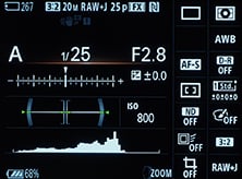 If you’re composing with the screen, the RX10 offer up to six views, again depending on which you have selected in the menus: one with lots of shooting information and the shutter and aperture indicated on scales superimposed on the image, one with detailed shooting information superimposed over all four sides of the image, another view that’s clean, a fourth with a live histogram, a fifth with a dual axis leveling gauge, and a sixth which dispenses with the live image and swaps it for a screen filled with detailed shooting information along with a dual-axis leveling gauge and a very large live histogram. Like the viewfinder you can also superimpose a choice of alignment grids over all the display views, apart from of course the full-screen information option.