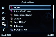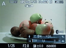 The STYLUS 1 viewfinder offers six display views if you have everything enabled in the Custom menu, and pressing the INFO button cycles through them. You start with a clean image, followed by a choice of two dual-axis leveling gauges (one using scales at the bottom and right side of the image and the other using a central heads-up style graphic), followed by a page with more detailed shooting information, one with a live histogram (with adjustable saturation points in a Custom menu) and finally one which indicates saturated shadow and highlight details. You can also enable one of four alignment grids chosen from a Custom menu which appear on all display views. The STYLUS 1 also superimposes its shooting information over the active image. The exact same views are replicated on the main screen.
