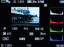 During playback you can cycle between a clean view, one with shooting information and a third page which displays a thumbnail with flashing highlights and shadows, surrounded by more detailed shooting details and RGB plus brightness histograms; if your photo is in the portrait orientation, it’ll automatically fill the screen if the camera is turned on its side during playback.
