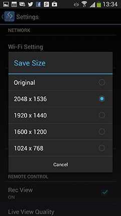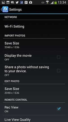The second option on the app is to Import Photos and pressing it displays a thumbnail view of the card’s contents which you can scroll through. Tapping a photo displays it full-screen, after which you can pinch to zoom-in for a closer look, albeit not at the maximum resolution. If you like what you see you can save the image to your handset by tapping the floppy disk icon, or share it using the sharing icon alongside – of course once it’s saved onto your handset you can also share it later. In the separate settings page you can choose to import images for saving or sharing at 1024×768, 1600×1200, 1920×1440, 2048×1536 or their original resolution – JPEGs only though, not RAW files.