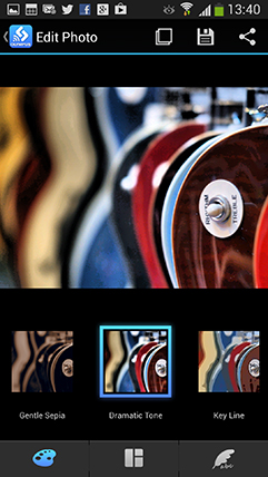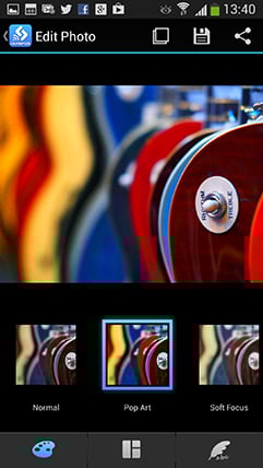 Choosing Edit Photo lets you perform a number of adjustments on images that have already been copied onto your handset. You can apply Art Filters, superimpose text, logos, even signatures written on your phone’s touchscreen, and play around with composite Photo Story arrangements.