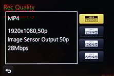 As before you can start and stop recording by pressing the dedicated red button near the shutter release. You can take photos while filming which share the same aspect ratio as the video, and with the choice of two quality options: if you don’t want the stills to interrupt the video, they can only be saved in a small size, but if you prefer a large version, it’ll temporarily blank the recording.