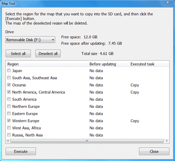 The separate regions and their map sizes are: Japan (731MB), South and Southeast Asia (317MB), Oceania (259MB), North and Central America (1.88GB), South America (237MB), Northern Europe (2.62GB), Eastern Europe (1.29GB), Western Europe (2.47GB), West Asia and Africa (277MB) and Russia and North Asia (1.51GB).