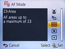 Next up comes the standard 23-area AF system, which the TZ40 / ZS30 defaults to in the absence of recognisable faces in the auto modes. The fourth AF mode is single-area, which as its name suggests, just uses one area for quicker response. Gratifyingly you can use the touch-screen to reposition this area almost anywhere on the image, although watch out for your thumb straying onto the edge of the screen and doing this by mistake. The fifth option is spot focusing, which works the same way as single-area, but unsurprisingly with a much smaller square; again this can be repositioned by tapping on the desired part of the image.