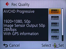 The AVCHD mode can record video in either 1080p at 28Mbit/s, or 1080i or 720p, both at a rate of 17Mbit/s. 1080p footage is recorded at 50p or 60p depending on region, while 1080i footage is recorded at 50i or 60i depending on region. 720p footage is recorded at 50p or 60p depending on region. You can choose to tag AVCHD movies with GPS location data, although it may cause incompatibilities with some devices. Using the best quality 1080p AVCHD mode, you’re looking at about 200Mbytes per minute of footage, considerably more than the 1080i and 720p AVCHD modes which consume closer to 120 Mbytes per minute of footage.