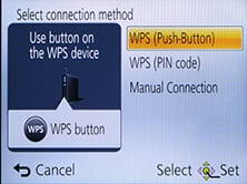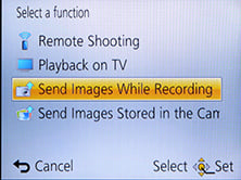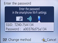If your phone / tablet doesn’t have NFC you’ll now need to press the Wifi button on the back of the camera and choose whether you want to remote control or transfer images. You can then choose whether to connect via an access point, or directly in which case the camera becomes the access point, broadcasting an SSID. You’ll need to select this SSID in the Wifi section of your phone or tablet, then enter the password provided by the camera.
