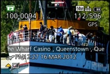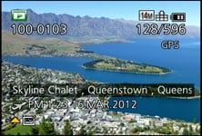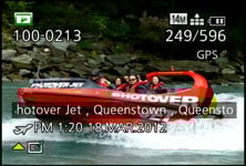 During playback, the DISP button cycles between a clean view and three other views with either GPS landmark details from the built-in database, detailed shooting information, or in a welcome upgrade over its predecessor actual GPS co-ordinates. If the histogram has been enabled in the menus, you’ll also see it during playback.