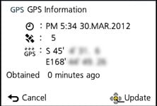 When powered-up, you’ll see a touch-icon halfway up the right side of the screen, and tapping it allows you to reposition or manually specify an area. To its side is a satellite icon with three bars underneath indicating progress on the searching process. Meanwhile, the GPS touch-button reads 5, 60, or 120, indicating the number of minutes since the last confirmed location; if the camera displays 120- it’s been over two hours since acquisition. During the re-acquisition process the camera displays the last known location, which can look a little odd if you’ve significantly moved-on since then, so unless you’re going to miss a spontaneous opportunity, it’s worth waiting for the signal to lock-on.