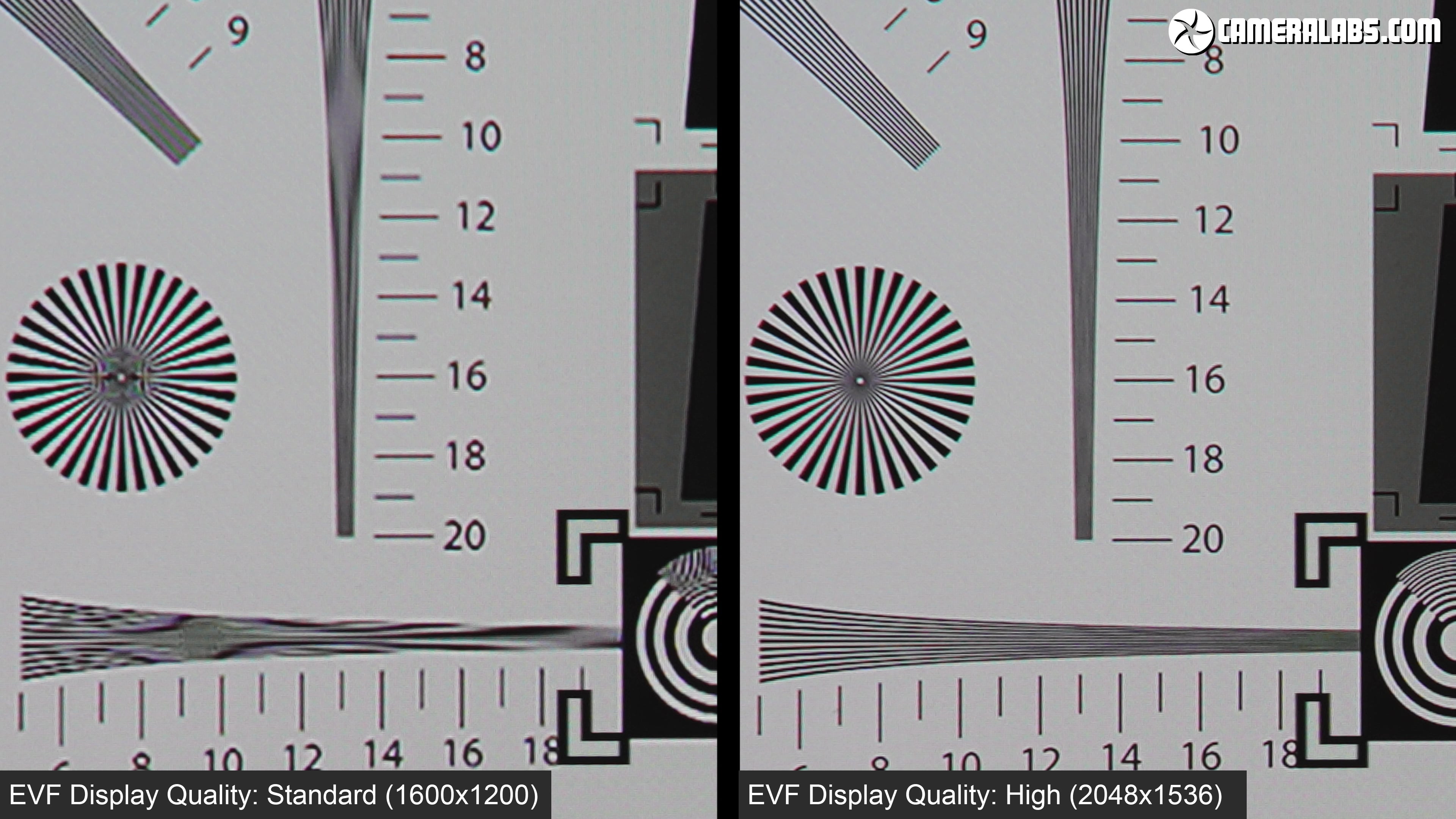 Above: Next let’s change the display quality from Standard to High and returning to the text chart shows much finer detail and greatly reduced moire. Now I filmed this in 4k, but the viewfinder resolution actually exceeds this especially since it’s not filling the capture area. So I switched to higher resolution still photos to better compare the resolving power.