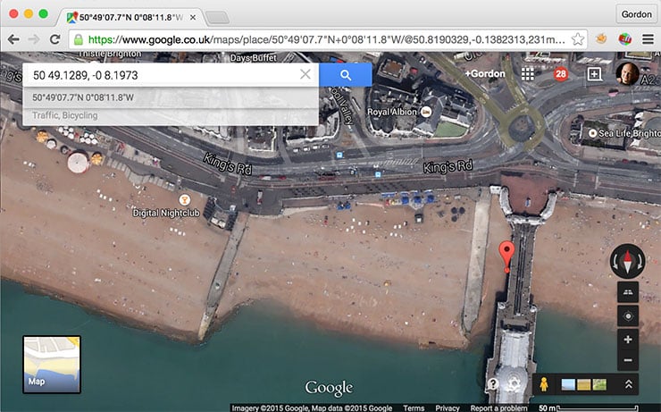 The third and final option lets you record a location log with your handset before syncing the co-ordinates later. This worked as you’d expect in practice so here’s an image I took in Brighton and later tagged with its position; I entered the co-ordinates into Google maps to make the screenshot you see here.