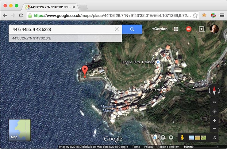 So the first thing you’ll need to do is enable it from the menus, after which you can set the receiver to automatically update at preset intervals or make a log (both of which take place whether the camera is on or off). The preset intervals are between every second and every five minutes with the default 15 seconds working well in my tests. Here’s an example of a shot I took in Manarola in Cinque Terre, Italy. I had the GPS enabled and entered the co-ordinates into Google Maps for the position below.