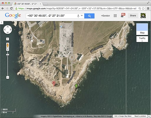 The accuracy of the position of course depends on your phone and how good a signal it had at the time you took the photo. If I’m consciously taking images I want accurately tagged, I’ll try and leave my phone at the top of my backpack, or at least stand still at a location for a while first. In the example below I had been shooting in the area for about half an hour before taking this shot of Portland Bill lighthouse (in Dorset, UK Southwest), but my phone was in my trouser pocket at all times which is far from ideal. That said, entering the embedded GPS co-ordinates into Google Maps placed me very accurately as seen in the screenshot below right, on the rocks just by the Sea. Indeed I’d say it was within a few meters.