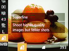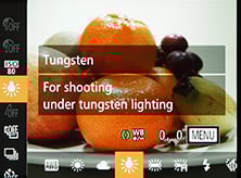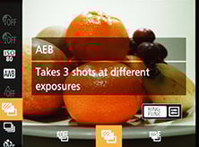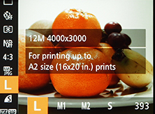 In the center of the thumb wheel on the rear is Canon’s usual FUNC / SET button which is used to fire-up the on-screen settings which depend on which mode is selected; in Program mode you can change the ISO, White Balance, Bracketing, Drive mode, Self Timer, Metering, ND filter, aspect ratio, Compression, Image Resolution and Movie quality. Finally, surrounding the wheel are four dedicated buttons for playback, movie record, MENU and RING FUNC to customise the Ring control.
