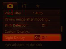 The S120 also lets you select a Night Display option which greatly dims the image and uses red text for menus to help preserve night-adapted vision in dark conditions – very handy if you’re using the new Star presets which I’ll talk about more below. Pressing the DISP button while composing cycles through two views, both customisable with any combination of the following: shooting information, grid lines, an electronic level (single axis) and a live histogram.