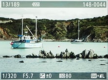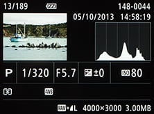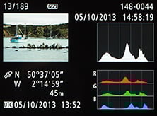 Pressing the DISP button during playback offers three views: one full screen with basic shooting information, another with a thumbnail and a brightness histogram, followed by the thumbnail again but this time with RGB histograms, and if previously embedded, the GPS location details.