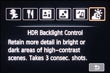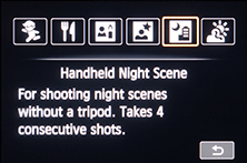Set the dial to SCN and you can choose from six scene presets: Kids, Food, Candlelight, Night Portrait, Handheld Night Scene and HDR Backlight Control. Of these the last two are composite modes which automatically capture and combine multiple frames to reduce shake / noise or increase dynamic range.
