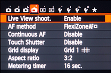 The Live View modes can also display an optional live histogram and or the choice of two different grids for alignment, although sadly no leveling gauge, unlike the Lumix G6.