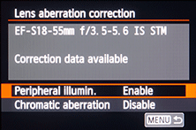 The SL1 / 100D also inherits Peripheral illumination and Chromatic Aberration corrections in a Lens Aberration menu, which are optionally applied to JPEG images to reduce the effect of vignetting and coloured fringing respectively. Peripheral illumination correction is enabled by default although Chromatic Aberration correction is not as it can impact the maximum burst size during continuous shooting. I’d recommend leaving it enabled for general use, but turning it off when you know you’re shooting fast action bursts.