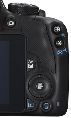Round the back, the Menu and Info buttons are to the left of the viewfinder, and the Live View / Movie record button to the right. In the upper right corner are the usual pair of AF Point selection and AE lock buttons which double-up as zoom-in and zoom-out during playback or Live View; due to the smaller body these are positioned vertically though, not side-by-side.