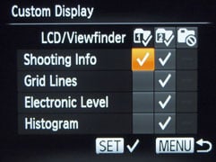 Pressing the down position on the rear control wheel toggles to the second display overlay which adds a live histogram, square grid and a two-axis electronic level – upgraded from the single axis display on the G12 (and the G1 X). All of this is great, but it would be even better if Canon had provided some way of cycling though these two display options without having to go through the display off mode. As it is, if you want to use the histogram, grid, or level, after activating it, you must press down twice on the control wheel to first turn off the display, then get back to the first overlay. While you can customise or de-activate any of the overlays, this isn’t really a solution if you want to toggle between the overlays on some occasions and turn the display off on others. And it’s another argument for including a proximity sensor.