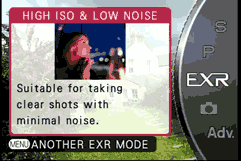 With the mode dial in the EXR position four options are available from the menu. The first of these and the default mode, EXR Auto is a ‘conventional’ program auto mode with scene detection. It differentiates 27 scene types broadly categorized into those with and without people, landscapes, backlit, night shots, and those containing sky, greenery and sunsets.