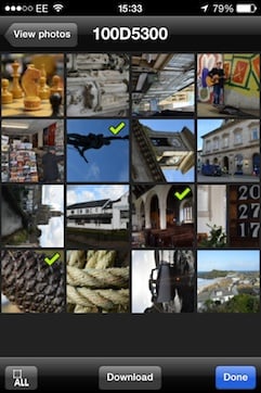 The second top menu option on the app allows you to view images on the camera card and download them to your phone. You can select individual images or download everything on the card and as well as original full-sized images you have the option of downloading 640×480 resized photos or letting the app choose an appropriate size on the basis of the device you’re transferring to. It took a little under 20 seconds to transfer a large fine JPEG to my iPhone.