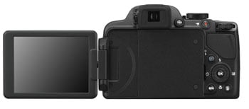 Like most super-zooms, the screen and EVF provide alternative options for viewing the same information, you can’t for example use the EVF for live view while displaying exposure information on the screen. The COOLPIX P520 employs a unique (among these three models, at any rate) method for switching between the EVF and the screen. The EVF is only active, when the screen is in the closed position. Flip it out and the screen becomes the viewer, with the EVF automatically switched off.
