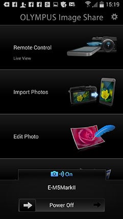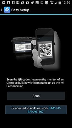 To get started, install the free Olympus Share app on your phone or tablet; it’s available for iOS or Android devices and I tested the latter on my Samsung Galaxy S4. Next tap the Wifi icon in the top right corner of the screen (you may need to press the info button to see it), then the EM5 Mark II will display a QR code on-screen.