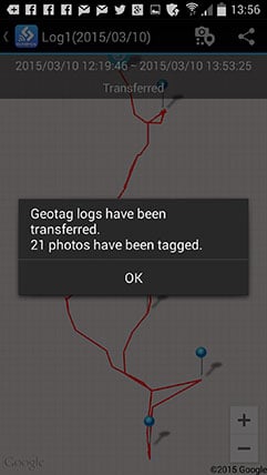 The actual tagging is a very easy process: if it’s enabled the app will actually offer to tag your photos as soon as the phone and camera are next connected over Wifi. The process is fairly quick too, and the app can additionally plot a log on a Google map, although you may need to disconnect from the camera to load the map details from the internet.