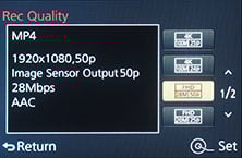 Set the LX100 to AVCHD encoding and you can choose from 1080 at 50p / 60p (at 28Mbit/s), 50i / 60i (at 24 or 17 Mbit/s), or 24p (at 24 Mbit/s). You can’t choose between 50 and 60 rates, that’s defined by the origin of the camera.