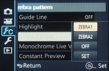 As a camera aimed at video professionals, there’s also a choice of Zebra patterns to indicate exposure. There’s two Zebra options, which you can independently preset to between 50 and 105% in 5% intervals. There’s also focus peaking available when manually focusing.