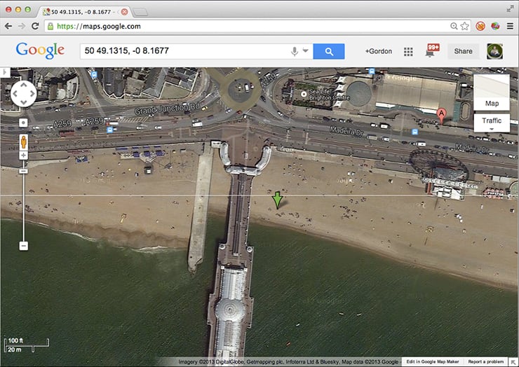 Out of curiousity I entered the co-ordinates of several images into Google maps and was impressed to find some were extremely accurate – indeed one I took was literally bang-on. Below is an image I took of Brighton Pier from the beach, and below that is the position recorded by the GPS on my phone and later embedded in the image file. I’d say this was within a couple of meters of my actual shooting position, and reassuringly my phone was in my pocket at the time, although I had remained fairly still for a few minutes prior to the photo.