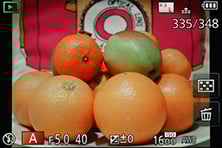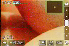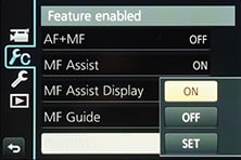 When the top dial is set to MF you can enable a wealth of manual focusing assistance. First there’s a magnified view, either using a small window in the middle showing an enlarged view at 3x to 6x, or a full-screen view at 3x to 10x.