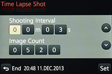 The Time Lapse Shot timer can be set to record up to 9999 frames at intervals from one second to a second shy of 100 minutes, and you can delay the starting time by up to 24 hours. The Stop Motion mode can also be set to record at regular intervals, or you can trigger the shutter by hand each time, allowing you to create animated movies.