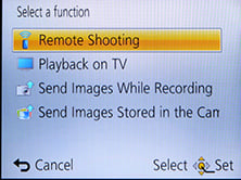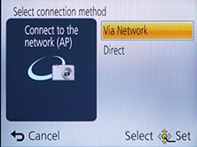 If your phone / tablet doesn’t have NFC you’ll now need to press the Wifi button on the back of the camera and choose whether you want to remote control or transfer images. You can then choose whether to connect via an access point, or directly in which case the camera becomes the access point, broadcasting an SSID. You’ll need to select this SSID in the Wifi section of your phone or tablet, then enter the password provided by the camera.