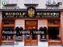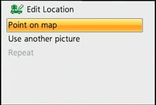 Press the Menu button and you’re presented with large icons to tap-into the various sub-menus. Meanwhile during playback you can swipe the screen to scroll through photos, along with tapping buttons to zoom-in or out. Once zoomed-in, you can also drag the image around with your finger, and perhaps in an attempt to encourage the touch-interface, it does so much more quickly than scrolling with the traditional buttons. You can now also use the touch-screen to edit the GPS / landmark information by simply tapping on the desired area of the new on-screen map.