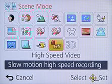 Turning the dial to SCN lets you choose from 19 Scene Presets (one more than the TZ30 / ZS20) which include Handheld Night Shot, HDR and High Speed Video modes; note the Panorama scene preset from the TZ30 / ZS20 has now been promoted to the mode dial and the 3D mode demoted into the preset menu, a sensible swap in my opinion.