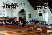 When powered-up, you’ll see a touch-icon halfway up the right side of the screen, and tapping it allows you to reposition or manually specify an area. To its side is a satellite icon with three bars underneath indicating progress on the searching process. Meanwhile, the GPS touch-button reads 5, 60, or 120, indicating the number of minutes since the last confirmed location; if the camera displays 120- it’s been over two hours since acquisition. During the re-acquisition process the camera displays the last known location, which can look a little odd if you’ve significantly moved-on since then, so unless you’re going to miss a spontaneous opportunity, it’s worth waiting for the signal to lock-on.