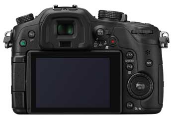 As before, the rear is largely dominated by the articulated 3 inch screen, an OLED touch-screen replacing the LCD one on the GH2. Above it on the left of the viewfinder the button to toggle between the screen and viewfinder is relabelled LVF and also functions as the fifth programmable function button, Fn5. Next to it is the playback button, relocated from the other side of the viewfinder on the GH2.