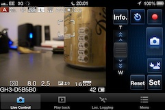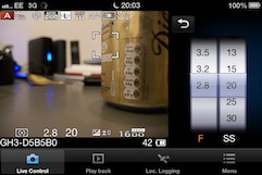 Next you launch the app – and this is where it gets interesting. I tested remote shooting on the Lumix GH3 using my iPhone 4S. In Live Control mode the display shows you almost exactly what you see on the screen or viewfinder which also remains live. With the detailed info overlay you can see all the same icons displaying shooting mode, Photo style, image size and quality focus mode and so on as well as the exposure settings.