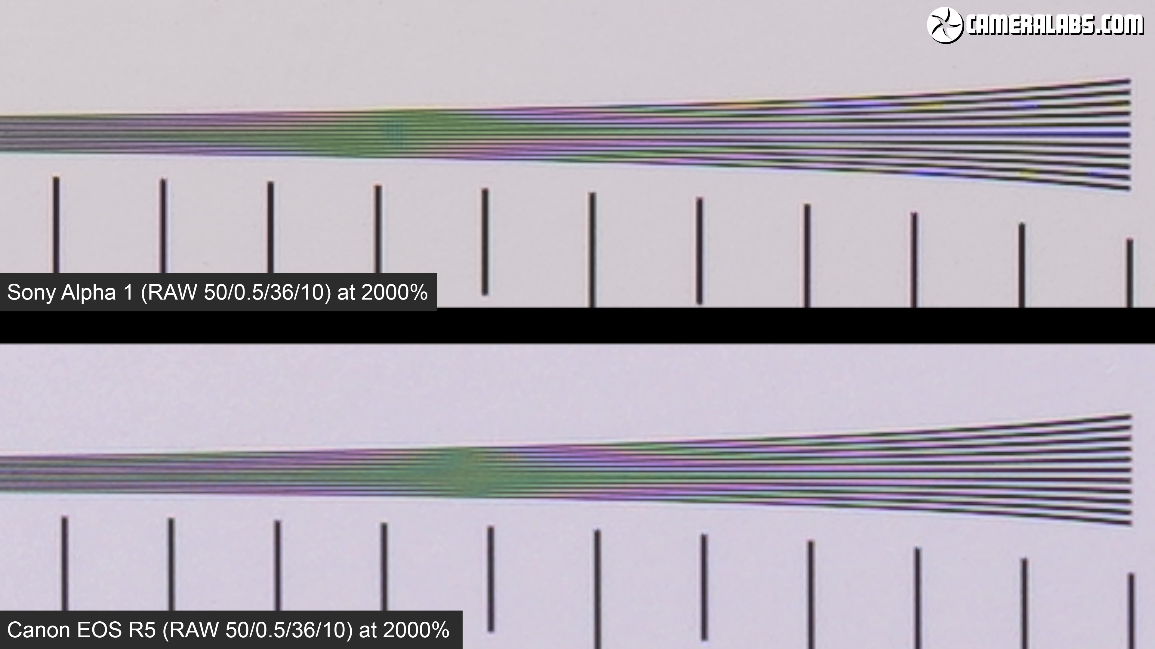 Above: So here on the top is the Sony Alpha 1 and on the bottom the Canon EOS R5, both using the same lens, the same aperture and the same RAW conversion settings. To show any difference here I’m having to magnify the image by 20 times in Final Cut. Technically this test confirms the Alpha 1 can slightly out-resolve the EOS R5 under perfect conditions, but we’re pixel-peeping to the extreme here and I wouldn’t choose one over the other in terms of sensor resolution.